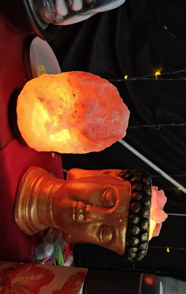Lámpara de sal con rocas de sal partidas y cable con interruptor de prendido/apagado.